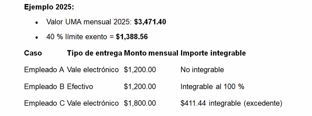 El artículo 27, fracción VI, de la Ley del Seguro Social (LSS) establece que no se integrarán al SBC los pagos por concepto de despensa, siempre que su valor no exceda del 40 % del valor mensual de la UMA y se entreguen en especie o mediante monedero electrónico autorizado.